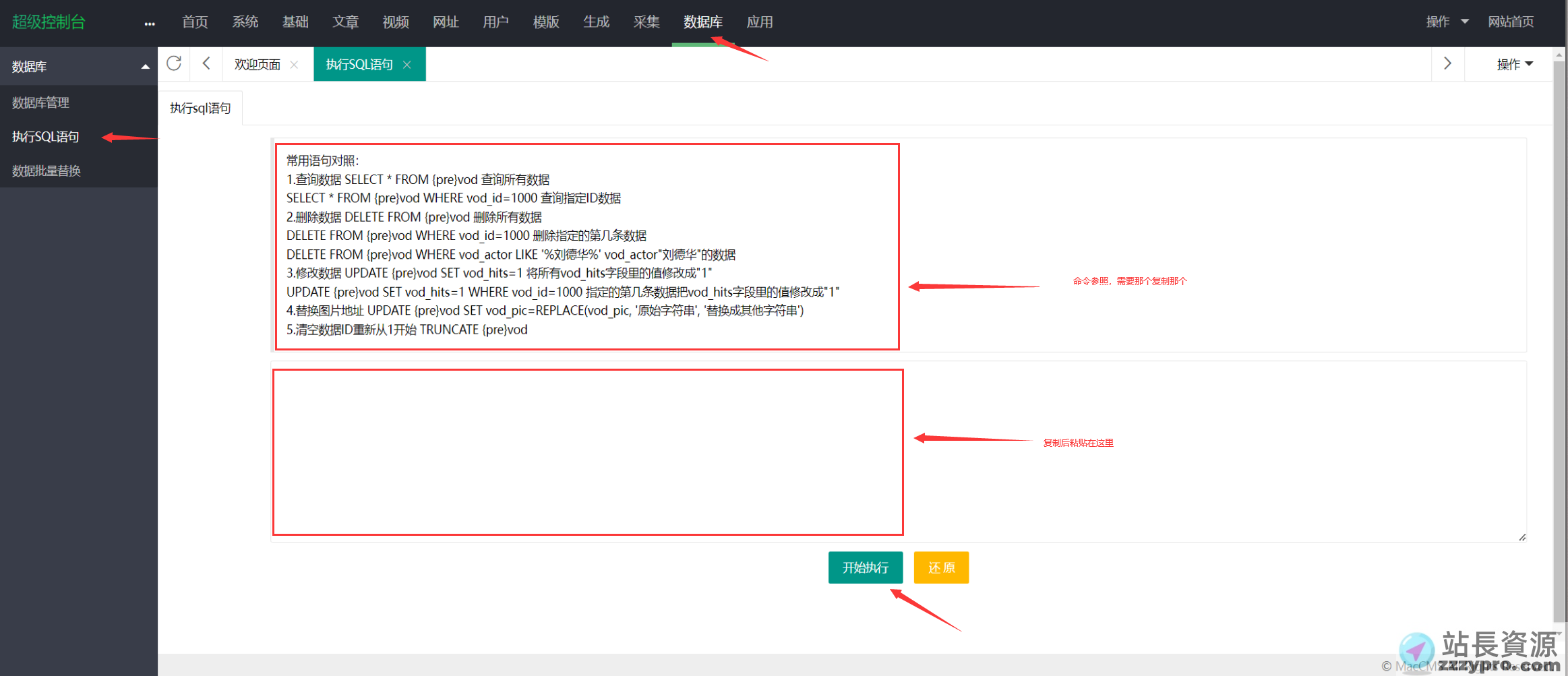 在苹果cms的后台点击顺序;数据库→执行sql语句→复制粘贴后点击执行