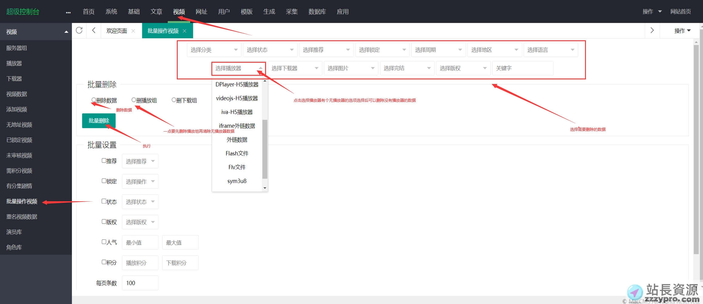 这个方法较为简单,也可以删除某个播放器。删除某个失效资源站的视频数据步骤;进入苹果cms后台 → 视频 → 批量操作视频 → 点击选择播放器选中资源站对应的播放器 → 选中删播放组 → 点击批量删除 → 点击选择播放器选中空播放器 → 选中删除数据 → 点击批量删除。