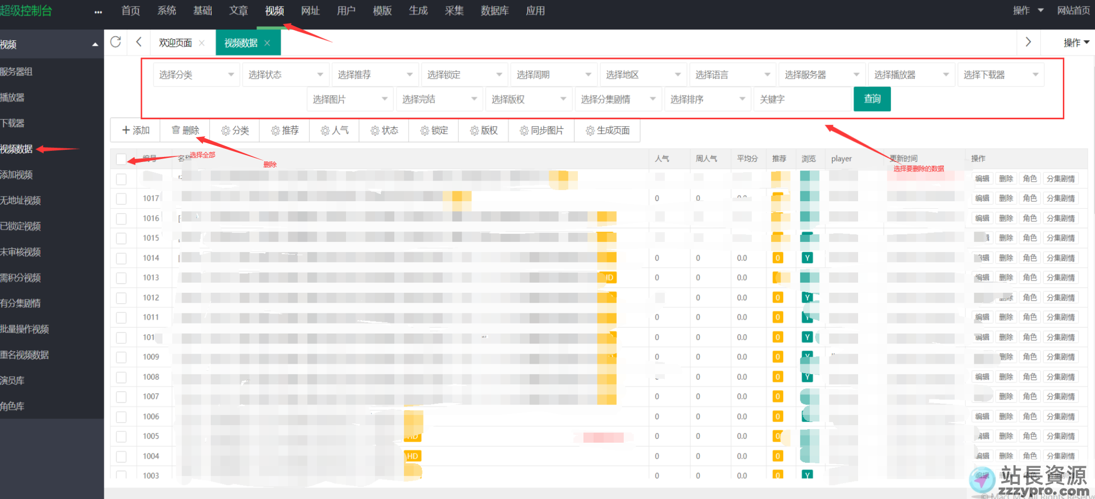步骤;进入苹果cms后台 → 数据 → 视频数据 → 根据页面选择要删除的视频 → 点击删除
