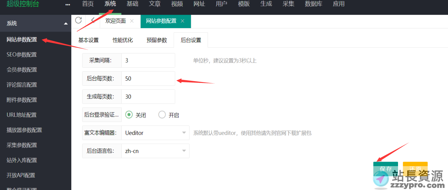 步骤;进入苹果cms后台 → 网站参数配置 → 后台设置 → 后台每页数后填入数量 → 保存