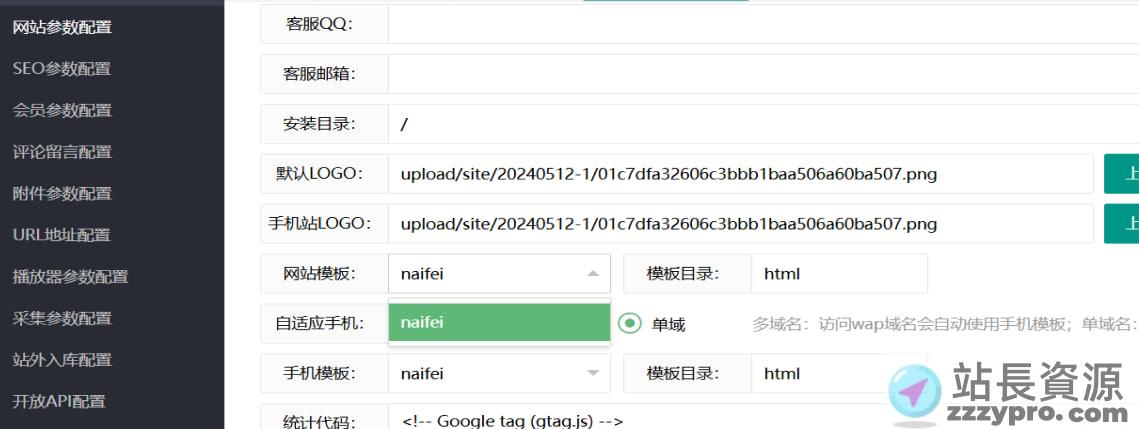 2.进入网站后台,点击“网站参数配置”找到“网站模板:”选择刚刚上传的模板,“模板目录:”需根据模板填写,模板文件夹里一般有所需配置说明,“手机模板:”如果是自适应模板,就和“模板目录:”填写一样的,如果不一样,就分别填写,一样要根据模板选择和填写。如下图: